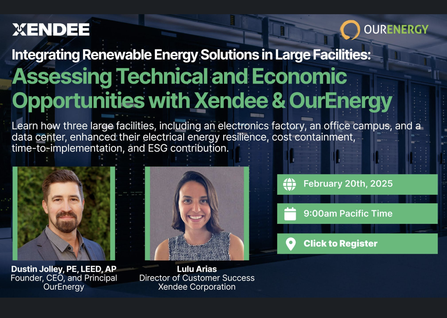 On February 20th, we'll be co-hosting our upcoming webinar, "Integrating Renewable Energy Solutions in Large Facilities," with our analysis tool partner, Xendee. We'll showcase three commercial and industrial case studies demonstrating optimization for energy resilience, cost containment, environmental benefits, and timely implementation.
